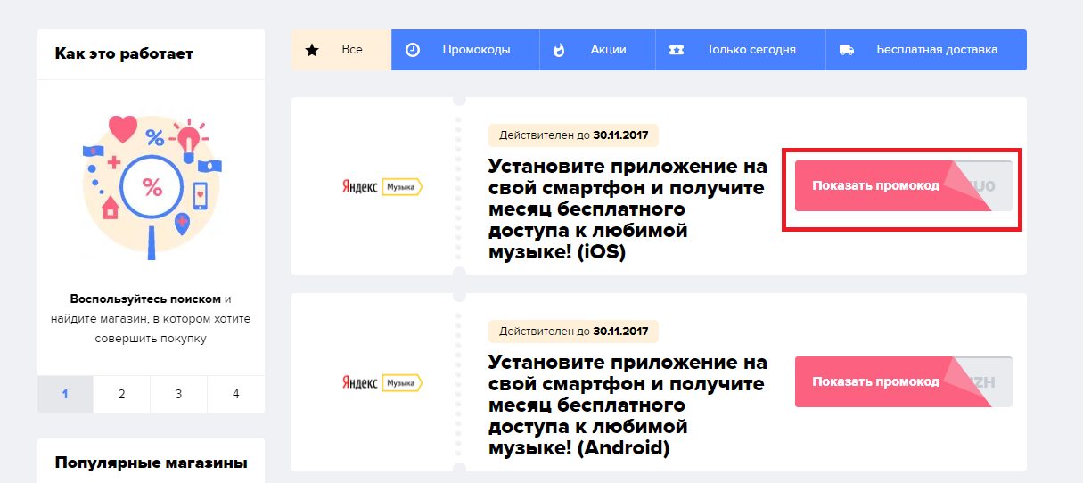 Выберите необходимый купон «Яндекс.Музыка» на скидку и скопируйте его текст.