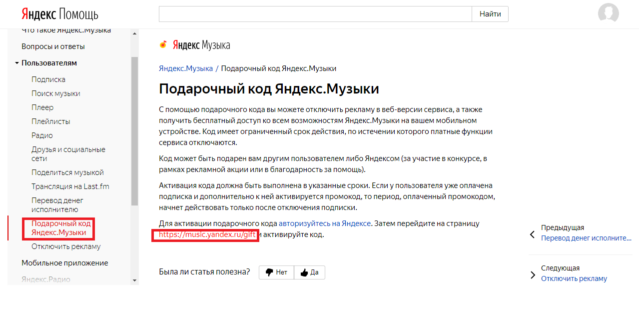 Выберите пункт меню «Подарочный код Яндекс.Музыки» и пройдите по ссылке, выделенной на изображении.